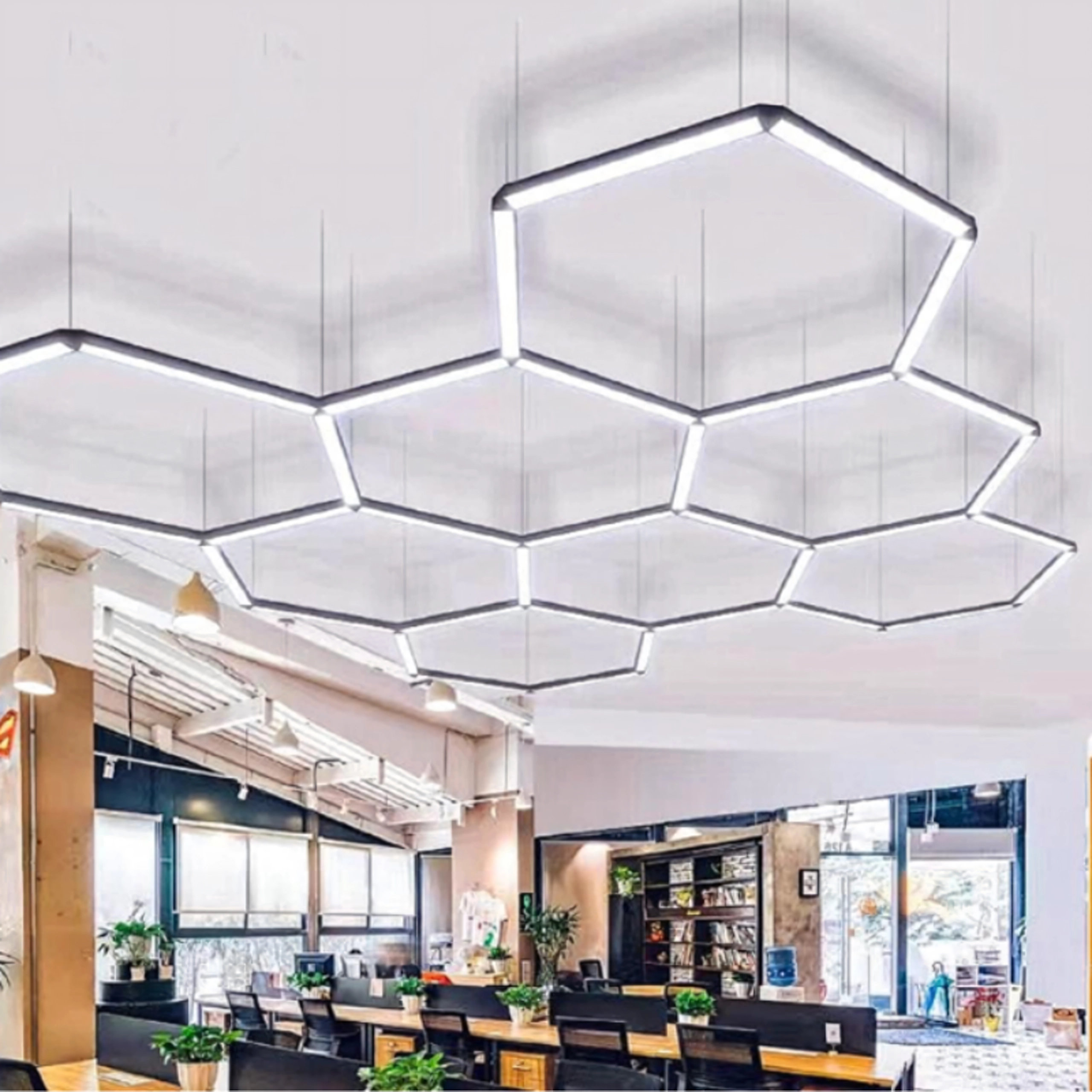 Sujungti šešiakampiai kuria korio efektą ir leidžia suformuoti patrauklų, funkcionalų lubų tinklelį.