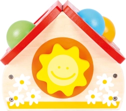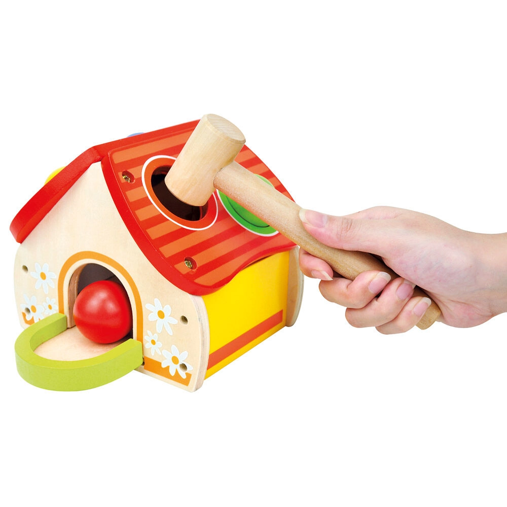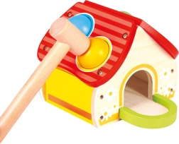 Šis kokybiškas medinis žaislas linksmu namelio pavidalu sudomina vaikus ryškiomis spalvomis ir paprastu žaidimo principu – kamuoliukai dedami į stogo angas ir švelniai kalami plaktuku. Pramoga skatina motorikos, kantrybės ir tikslumo ugdymą.
