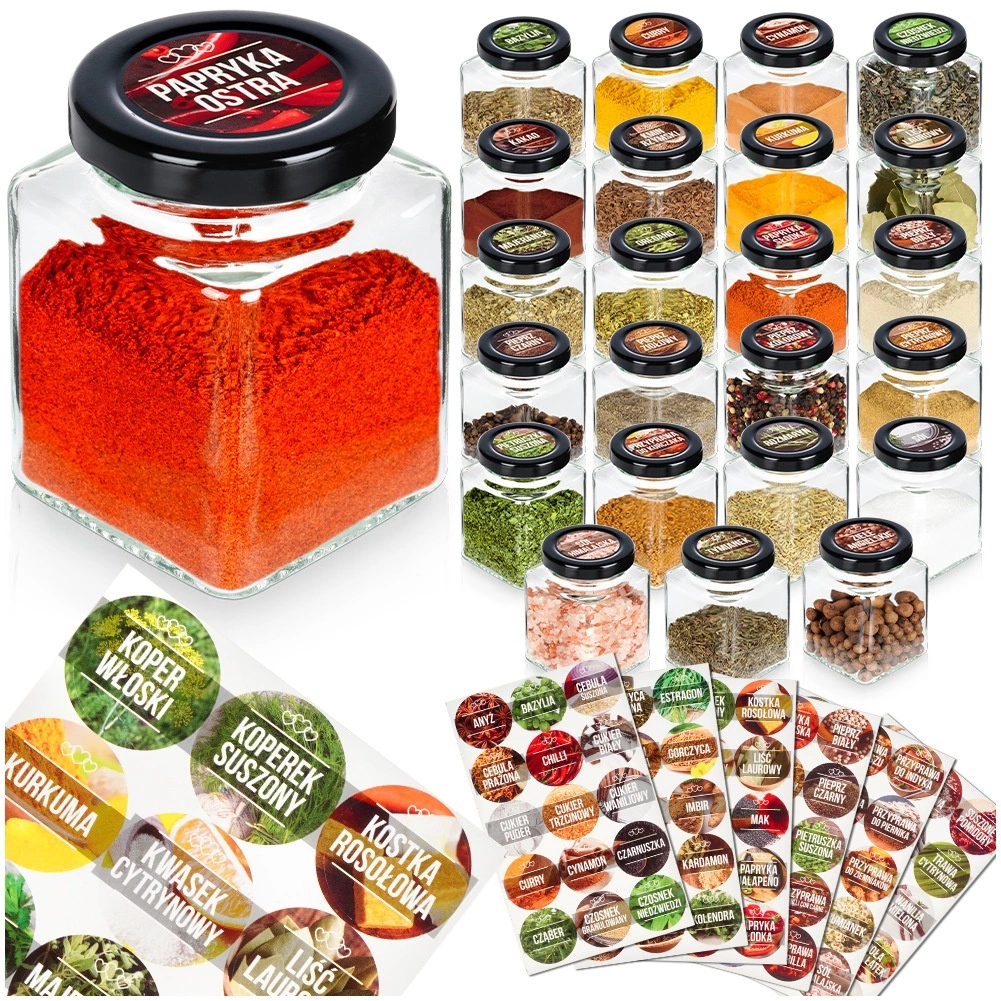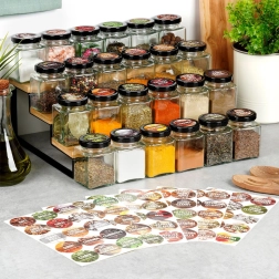 24 stikinių prieskonių indelių rinkinys su etiketėmis padės prieskonius ir žoleles laikyti sistemiškai ir visada po ranka – nuo stalčiaus iki virtuvinio stovo.