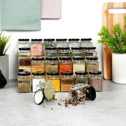 Įneškite į virtuvę tvarkos ir stiliaus. Šiame rinkinyje yra 24 elegantiški kvadratiniai indeliai (5,5 × 5,5 × 7,5 cm, 100 ml) iš skaidraus stiklo su juodais metaliniais dangteliais, kurie sandariai užsisuka ir saugo turinį nuo drėgmės. Pridėtos lipnios etiketės su populiariausių prieskonių ir žolelių pavadinimais padės išlaikyti tobulą tvarką.