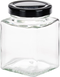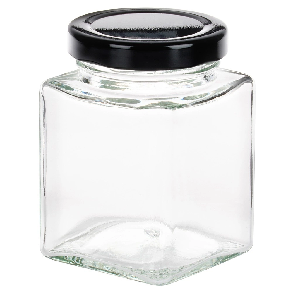 Skaidrus stiklas leidžia iš karto matyti turinį, o juodi metaliniai dangteliai su sriegiu saugo nuo drėgmės ir išlaiko aromatą.