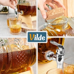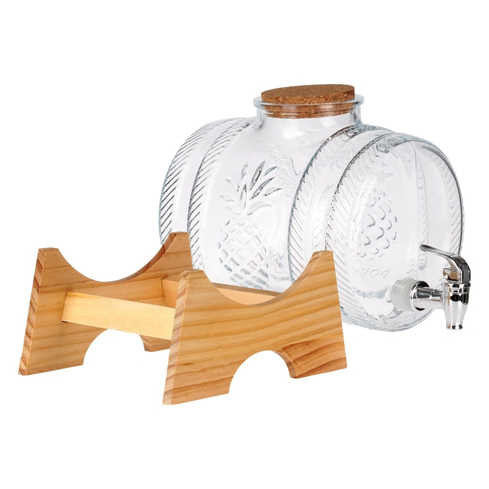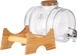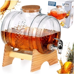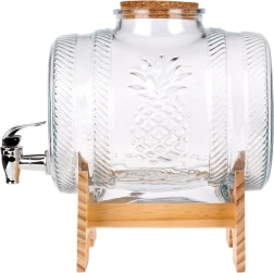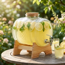 Šis elegantiškas gėrimų dozatorius derina aukštos kokybės storą stiklą su dekoratyviu ananaso reljefu, metalinį čiaupą sklandžiam pilstymui ir medinį stovą stabilumui bei patogumui. Dėl 5 litrų talpos puikiai tinka sodo vakarėliams, šeimos šventėms ir stilingiems bufetams. Kamštinis dangtelis palaiko gėrimą šviežią ir apsaugo nuo vabzdžių.