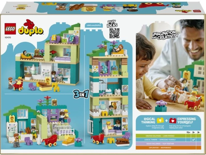 Atraskite universalią konstruktorių LEGO DUPLO modernus 3 viename šeimos namas su 166 detalėmis vaikams nuo 2 metų. Vaikai gali pastatyti 3 skirtingus namo modelius – vieno aukšto butą, trijų aukštų namą arba penkių aukštų namą su stogo sodu. Rinkinyje yra 4 šeimos figūrėlės ir daug priedų (vežimėlis, šaldytuvas, tualetas ir kt.), kurie skatina kūrybišką žaidimą, lavina smulkiąją motoriką ir socialinius įgūdžius.