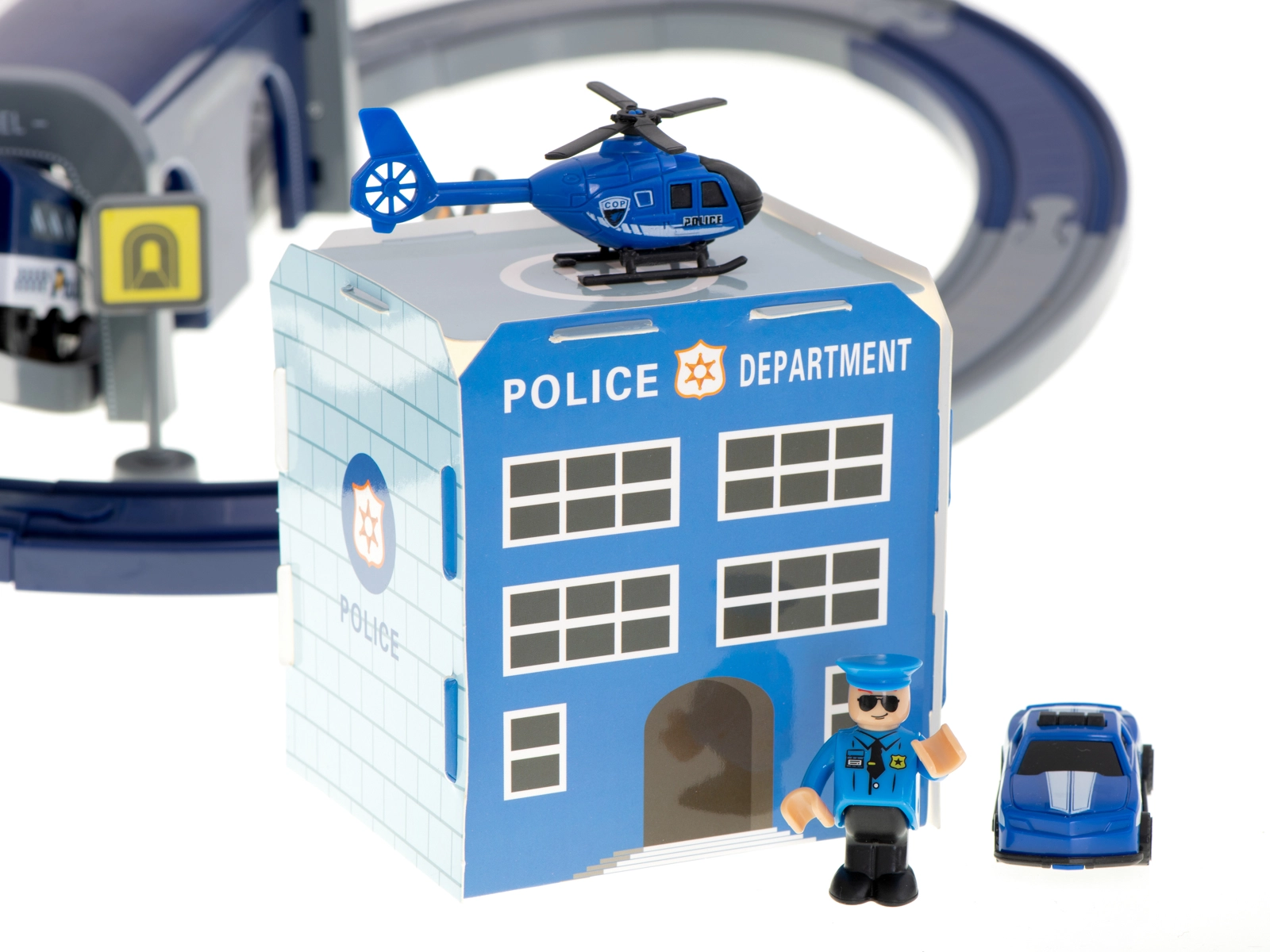 Policijos stotis su sraigtasparnio aikštele, 4 skirtingos transporto priemonės, sraigtasparnis, policininko figūrėlė ir kelio ženklai – viskas realistiškoms operacijoms ir saugaus eismo taisyklių mokymuisi.