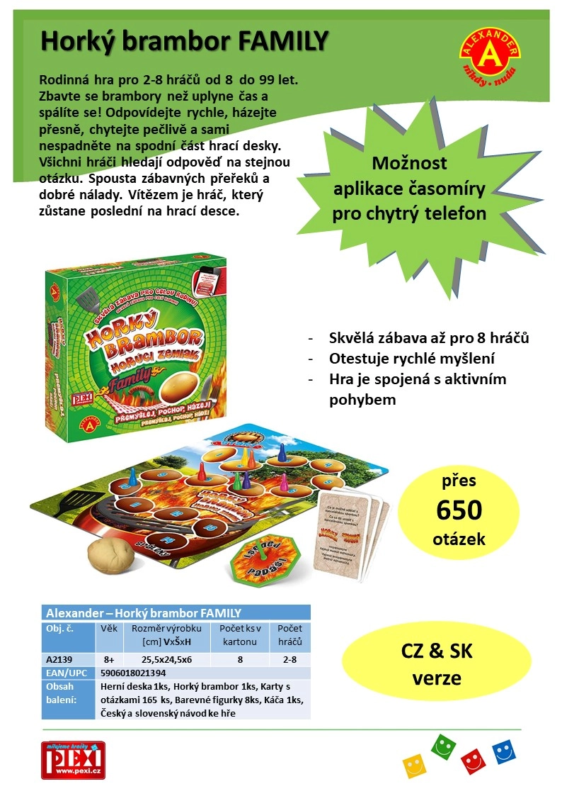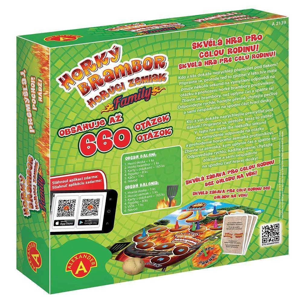Patirkite puikų šeimos linksmumą su paprastomis taisyklėmis! Žaidimas Karšta Bulvė skirtas 2–8 žaidėjams nuo 8 iki 99 metų. Atsakykite greitai, meskite tiksliai ir atsikratykite bulvės prieš pasibaigiant laikui!