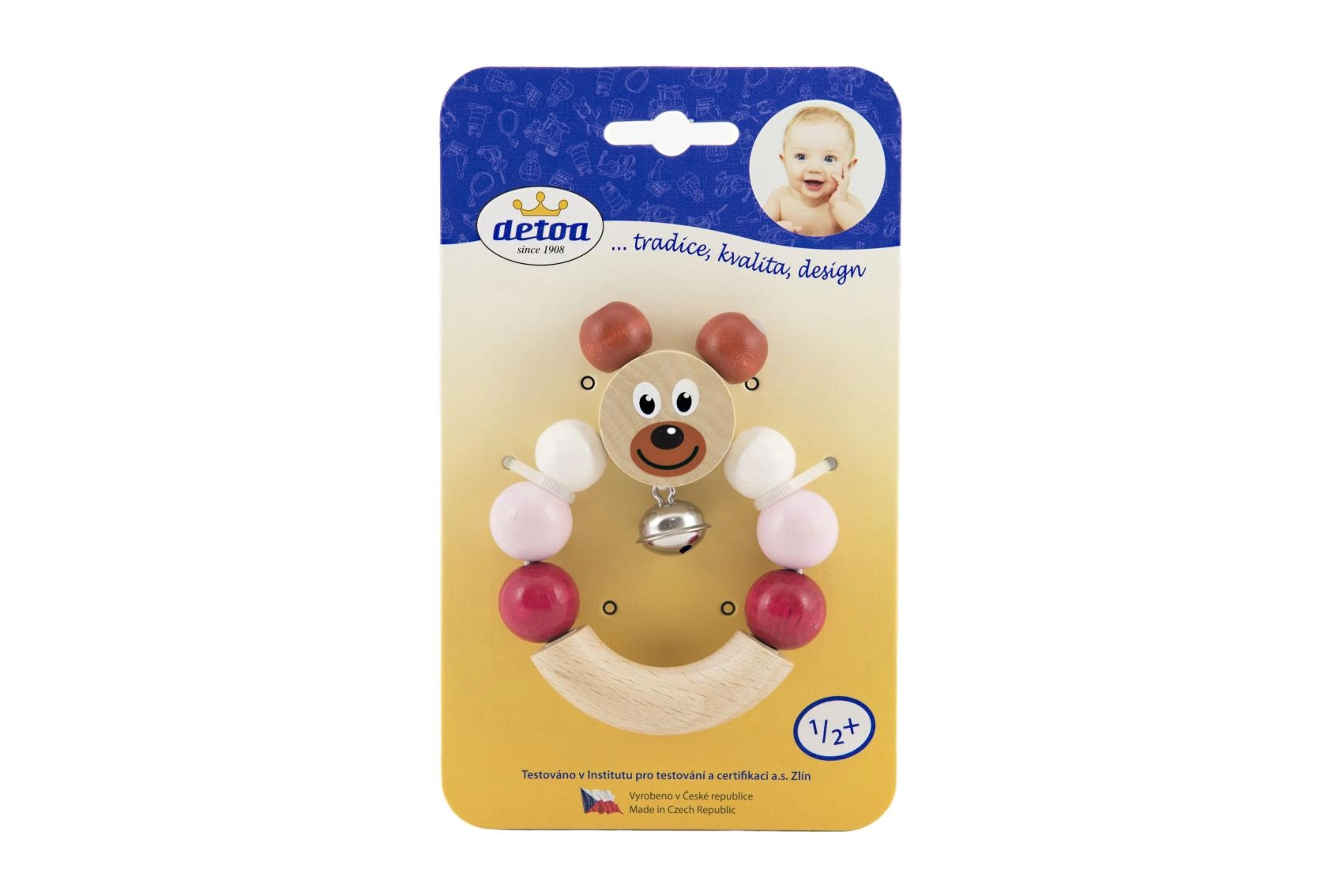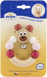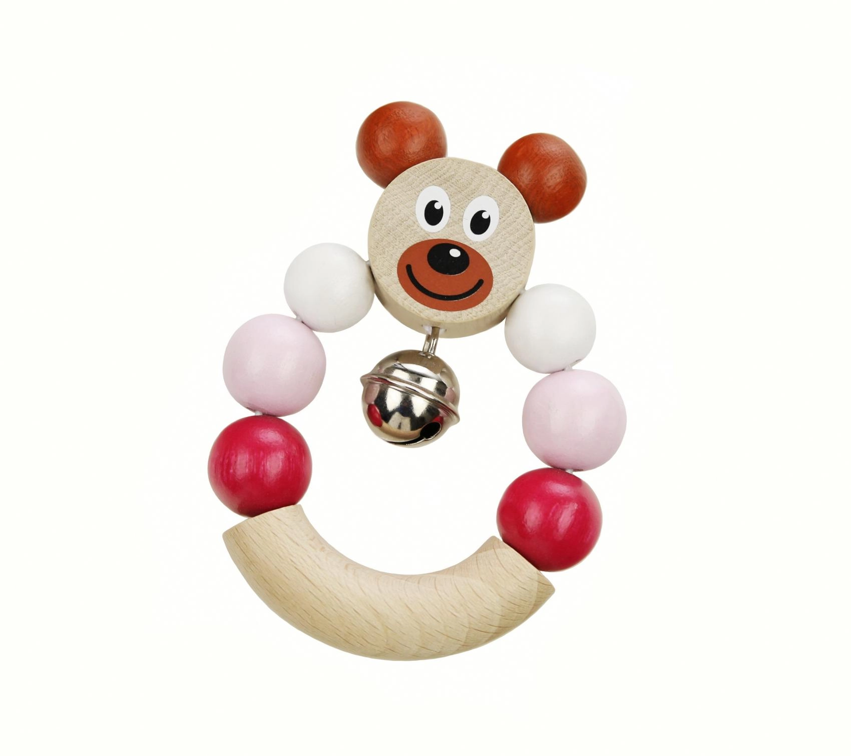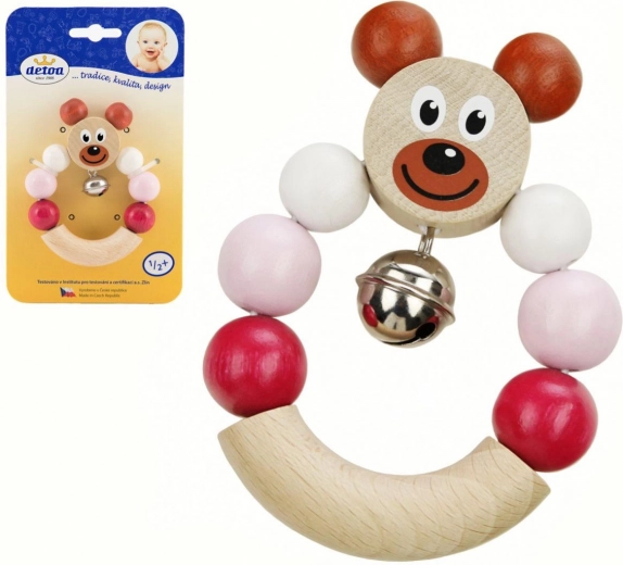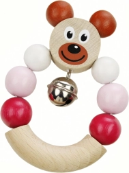 Žavingas medinis barškutis su rožiniu meškiuku pradžiugins kiekvieną kūdikį. Integruotas varpelis švelniai skamba, barškutis yra labai lengvas, o dėl kompaktiškų matmenų 7 × 9 cm puikiai telpa mažose rankytėse. Gaminyje laikomasi griežtų ES žaislų saugos reikalavimų, jis turi Saugus žaislas sertifikatą.