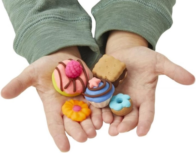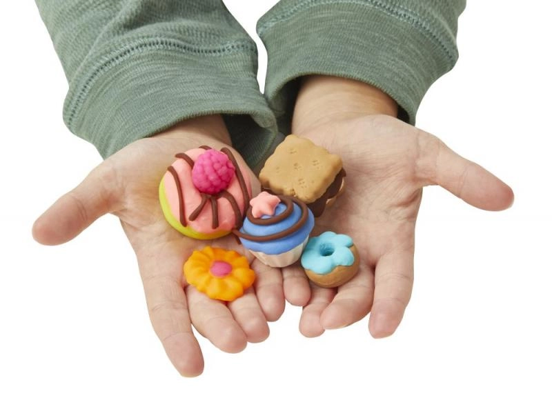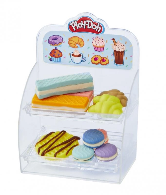 - Gėrimų aparatas su svirtimi, „plakto kremo“ stotelė, formelės sausainiams/keksiukams/spurgoms, puodeliai ir įrankiai, skaidri vitrina, 8 Play-Doh modeliavimo masės indeliai, iš viso 20 priedų