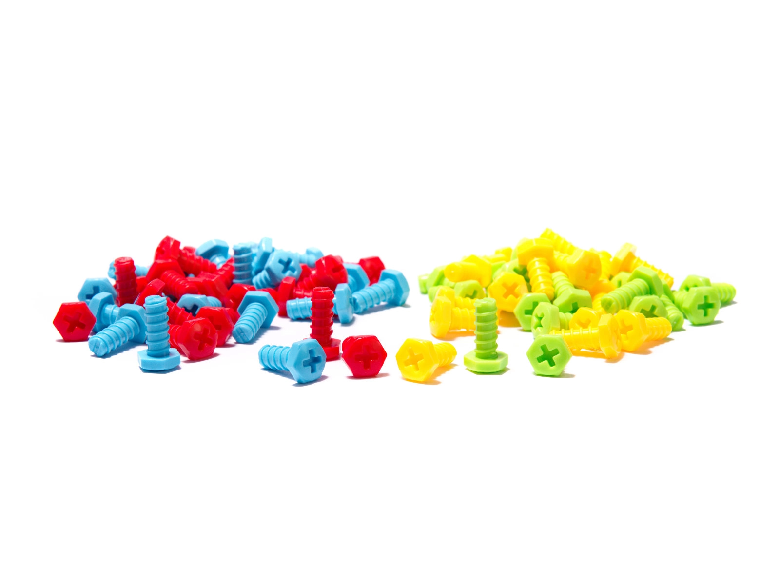 Rinkinį sudaro ryškūs varžtai ir detalės, kurios sudomina vaikus ir padeda lavinti jų motorinius įgūdžius.