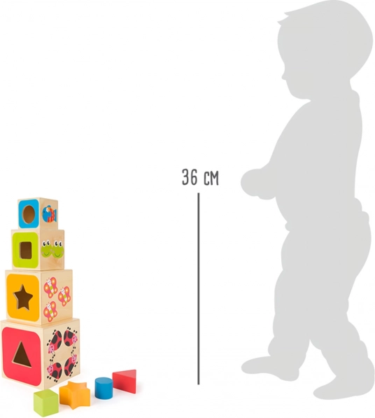 Kiekvienas kubelis papuoštas linksmomis gyvūnėlių iliustracijomis ir ryškiomis spalvomis, kurios skatina tyrinėti. Tiksliai išpjautos angos ugdo kantrybę ir susikaupimą, o bokšto statymas lavina rankos stabilumą ir erdvinę vaizduotę. Kokybiška medinė medžiaga maloni liesti ir atspari kasdieniam naudojimui.