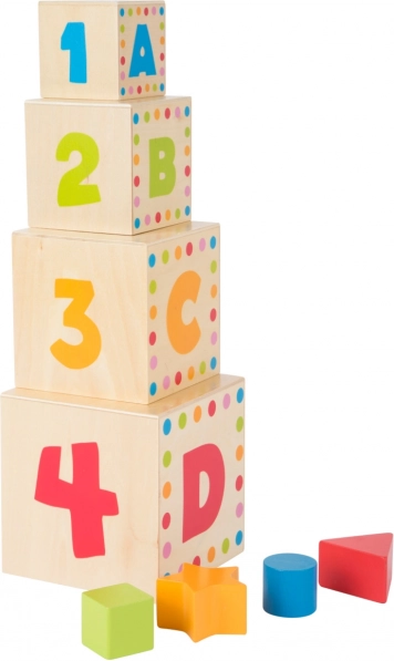 Medinės rūšiavimo dėžutės–kubeliai ABC small foot – ideali didaktinė priemonė pirmajam mokymuisi. Vaikai deda tinkamas formas į atitinkamas angas, stato kubelius vieną ant kito ir pagal spaudą susipažįsta su raidėmis bei skaičiais. Žaismingai treniruojamas figūrų ir spalvų atpažinimas, skaičiavimas ir abėcėlė.