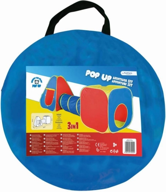 Smagus iššokantis 3 viename palapinių rinkinys pavers kambarį ar sodą vaikų žaidimų aikštele. Jame yra kubiška palapinė, tūnelis ir iššokanti palapinė, kuriuos galima naudoti kartu arba atskirai. Greitas be pastangų išskleidimas, lengva konstrukcija ir paprastas sandėliavimas užtikrina patogų žaidimą namuose ir lauke.