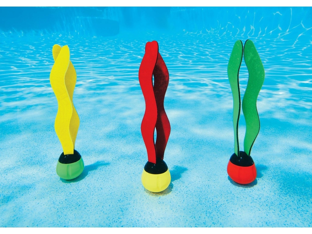 Rinkinyje yra 3 vienetai skirtingų spalvų derinių (geltona, raudona, žalia), kad po vandeniu būtų lengviau orientuotis. Minkštas plastikas yra malonus liesti ir patvarus, o audinio juostelės padidina matomumą ir patrauklumą žaidžiant baseine.