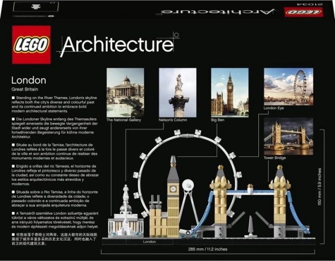LEGO Architecture Skyline kolekcijos rinkinys tiksliai atkuria žymiausias Londono įžymybes realistiškomis proporcijomis ir spalvomis. Ant elegantiško pjedestalo su dekoratyvine lentele „London“ rasite Nacionalinę galeriją, Nelsono koloną, London Eye, Big Beną (Elžbietos bokštą) ir Tower Bridge tiltą. Skaidrūs elementai pagrinde vaizduoja Temzės upės tėkmę, todėl modelis puikiai atrodo iš bet kurio kampo.