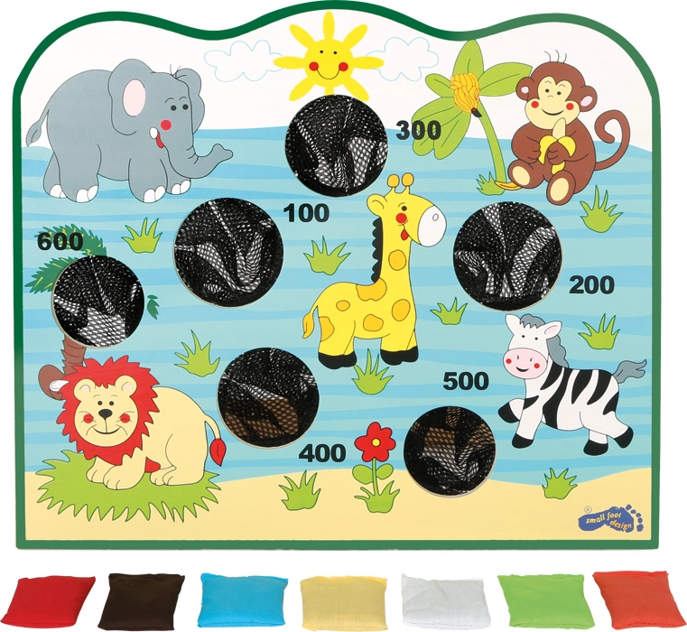 Žaidimo lenta su spalvingomis gyvūnų iliustracijomis ir ryškūs maišeliai daro žaidimą patrauklų ir smagų vaikams.