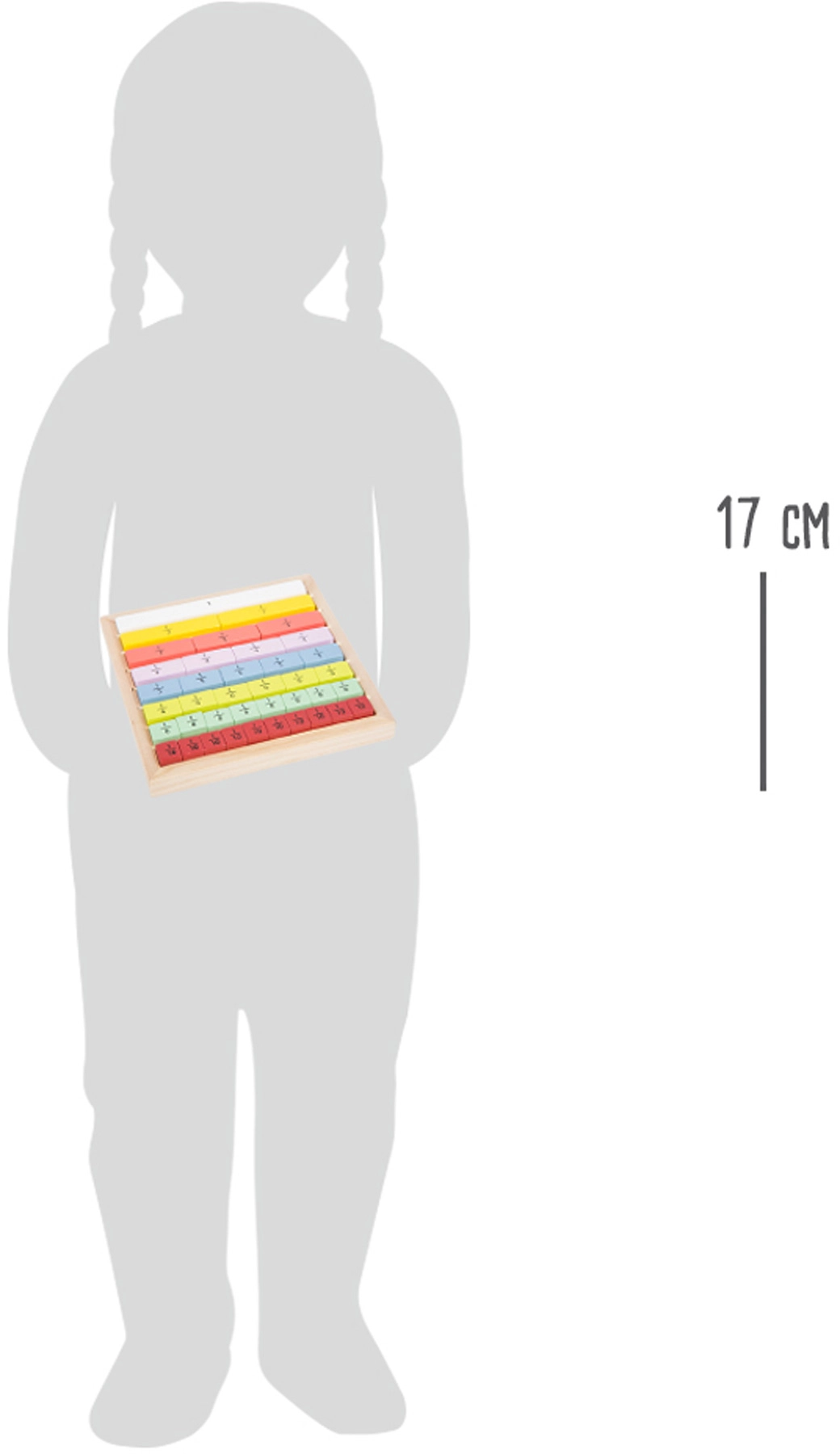Ši kokybiška ugdomoji priemonė iš Small Foot dirbtuvių suteikia vaikams spalvingą ir vaizdžią mokymosi formą. 39 mediniai elementai įvairaus ilgio ir spalvų su skaičių spauda padeda suprasti trupmenų principą ir jų sudėjimą į visumą. Dėl tvirtos 100 % FSC kilmės medienos žaidimas yra patvarus ir draugiškas gamtai.