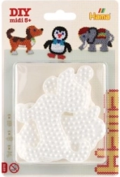 Hama lyginamų karoliukų pagrindų rinkinys leidžia vaikams nuo 5 metų kurti spalvingus paveikslėlius naudojant baltus plastikinius pagrindus dramblio, pingvino ir šuniuko formų.