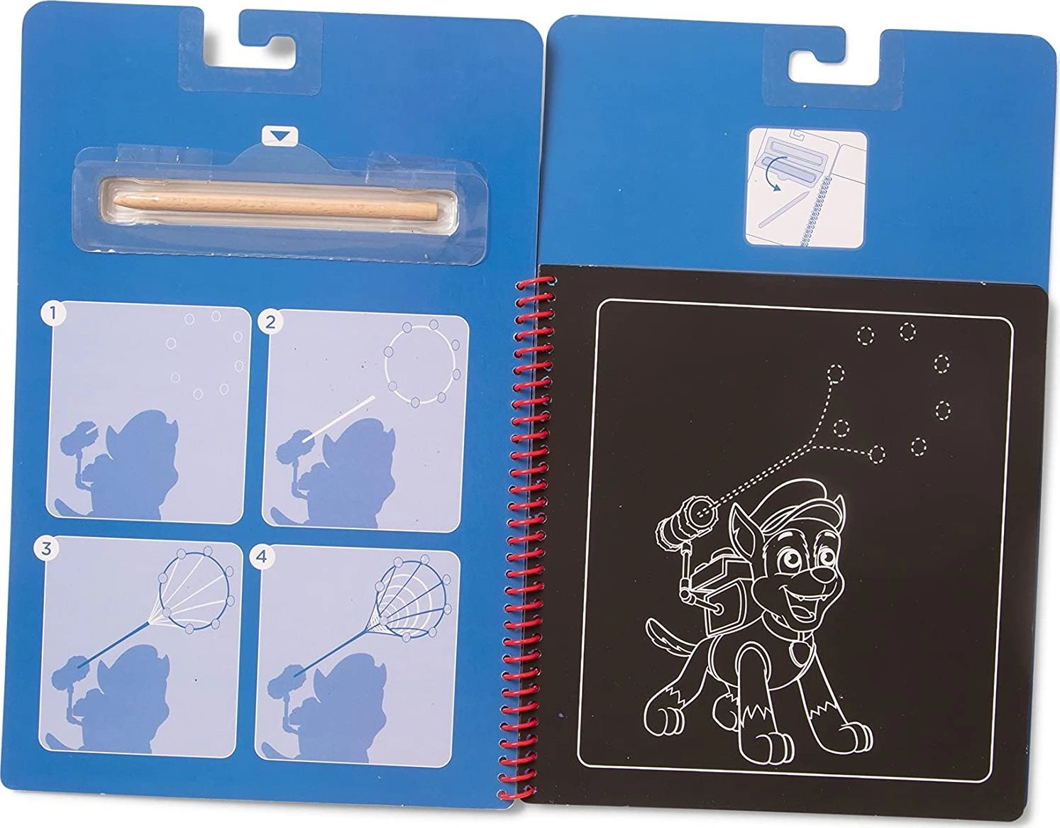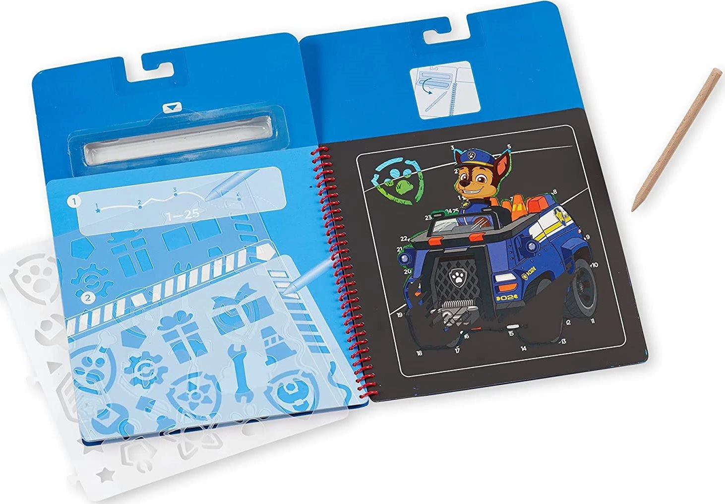 Po juodu sluoksniu slepiasi ryškūs PAW PATROL motyvai. Vaikai lengvai sukurs patrauklius piešinius be dažų ar klijų.