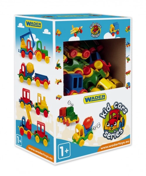 Mini plastikiniai Kid Cars automobiliukai 10 cm – 10 rūšių miksas, dėžė 54 vnt.