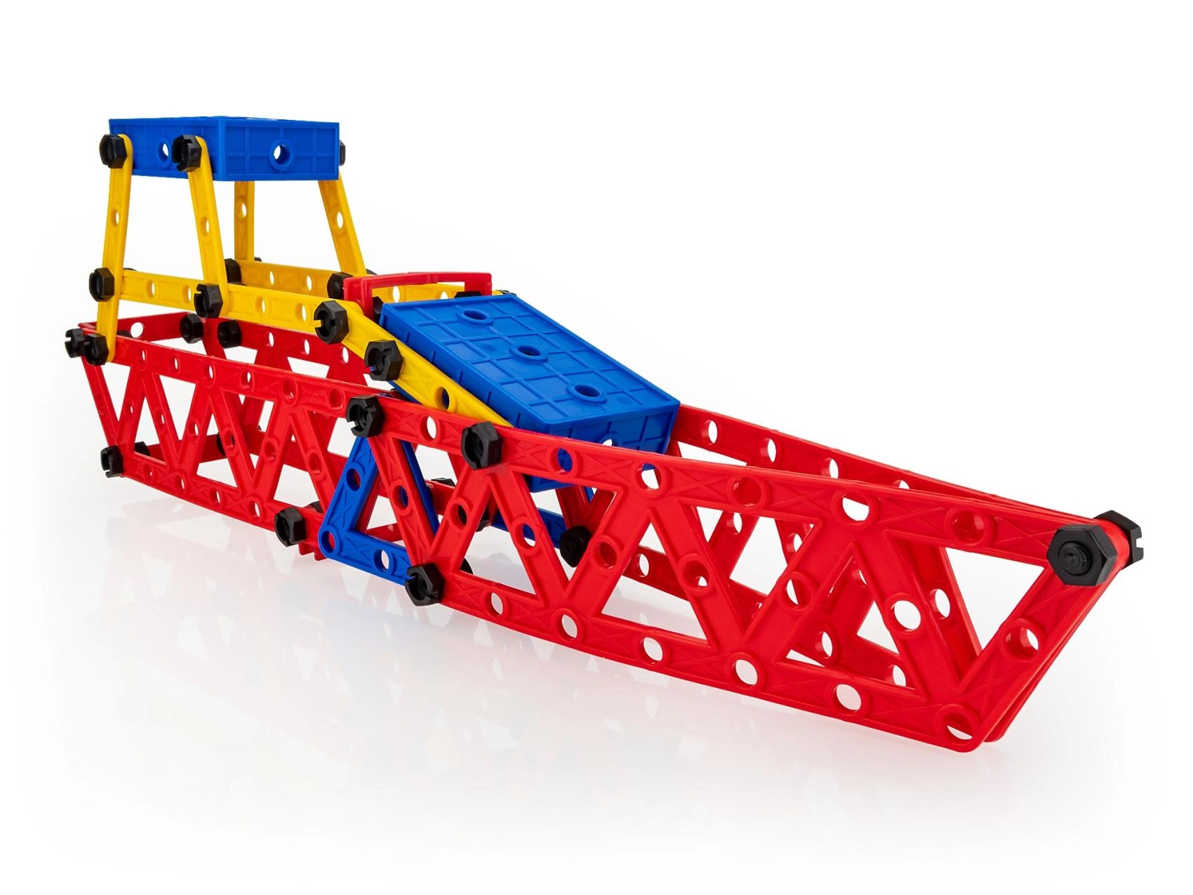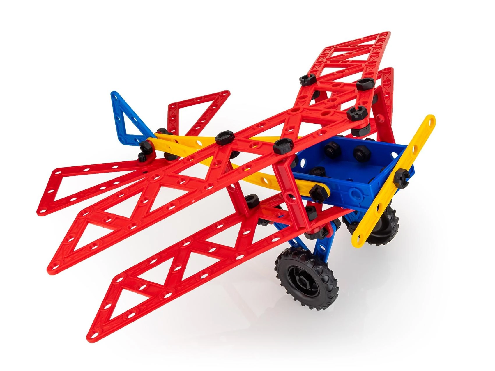 Dideli perforuoti skydeliai, sijos ir jungtys leidžia surinkti įvairius modelius – nuo lėktuvo iki laivo, fantazijai ribų nėra.
