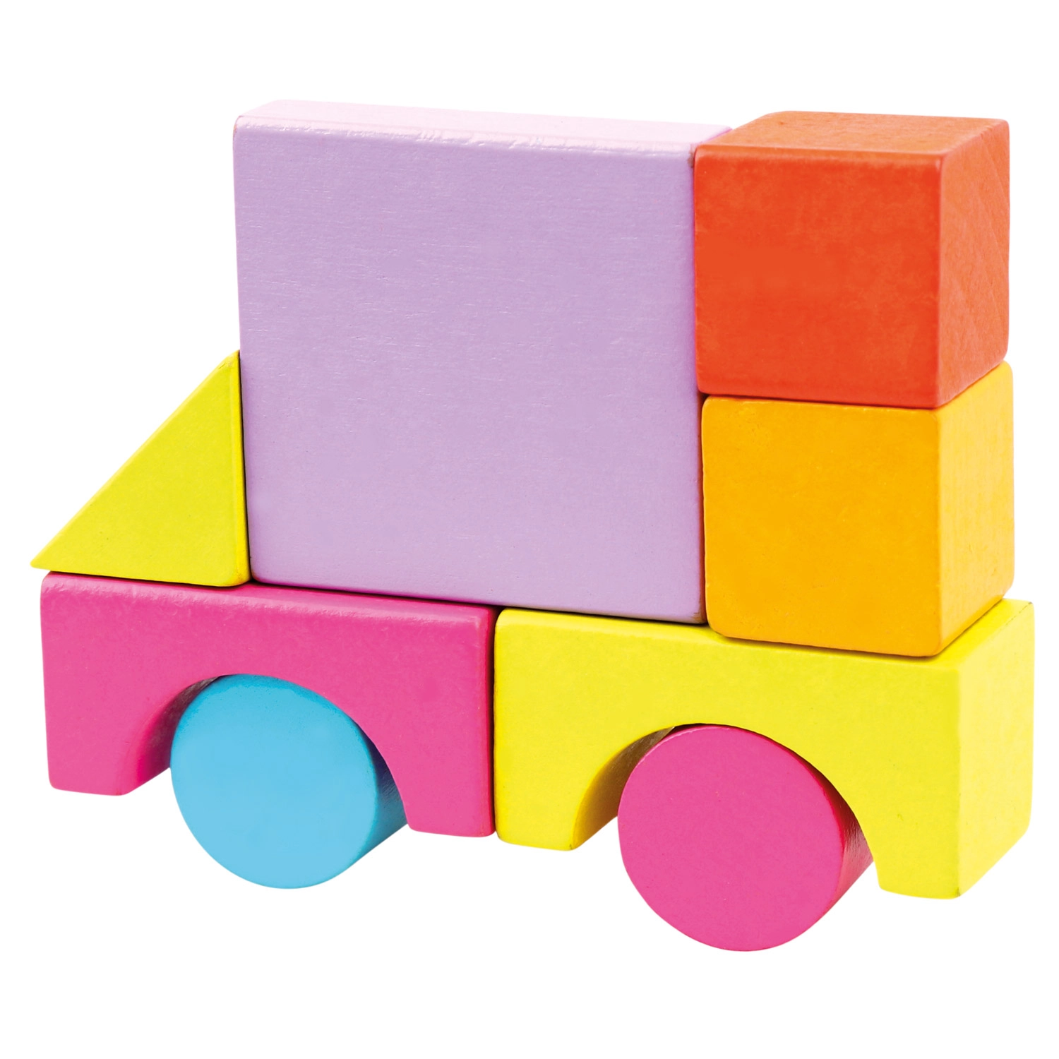 Rinkinyje rasite įvairių formų kaladėles – kubelius, stačiakampius gretasienius, cilindrus, lankus ir trikampius – ryškių spalvų, kurios skatina kūrybišką ir atvirą žaidimą.