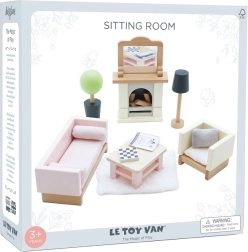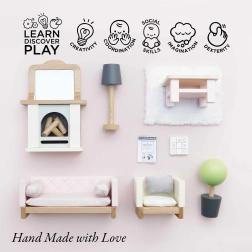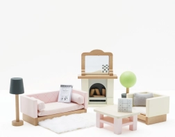 Rinkinyje yra 19 dalių: sofa ir krėslas su tekstilinėmis pagalvėlėmis, kavos staliukas, židinys su malkomis ir veidrodžiu, kilimas, gėlė vazonėlyje ir lempa. Dydžiu tinka Le Toy Van lėlių nameliams. Daugiau Daisylane serijos lėlių namelių priedų rasite mūsų svetainėje.