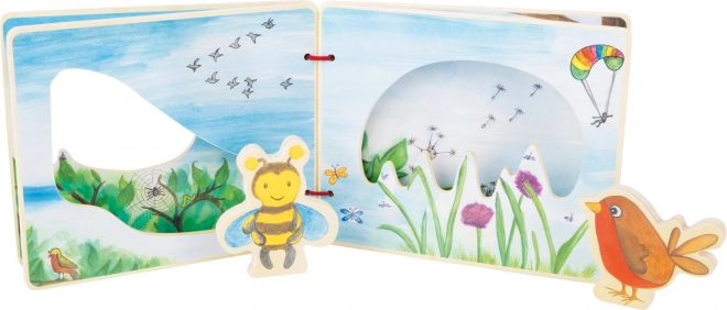- Medinė paveikslėlių knygelė + 2 medinės figūrėlės (bitutė, paukštelis)