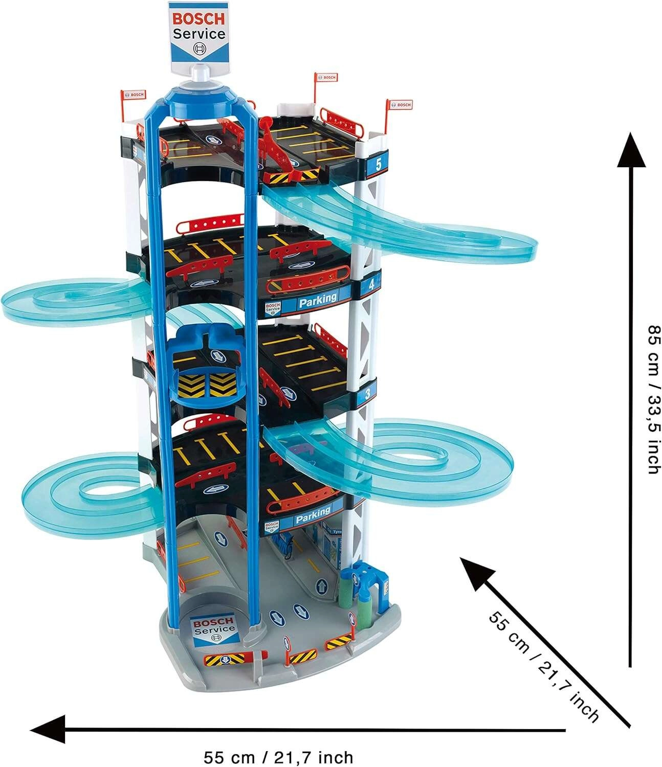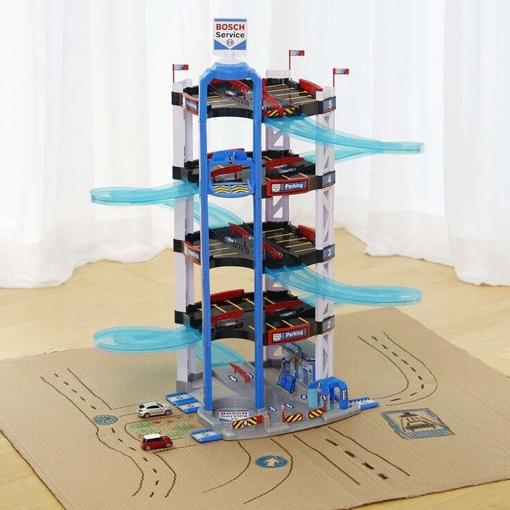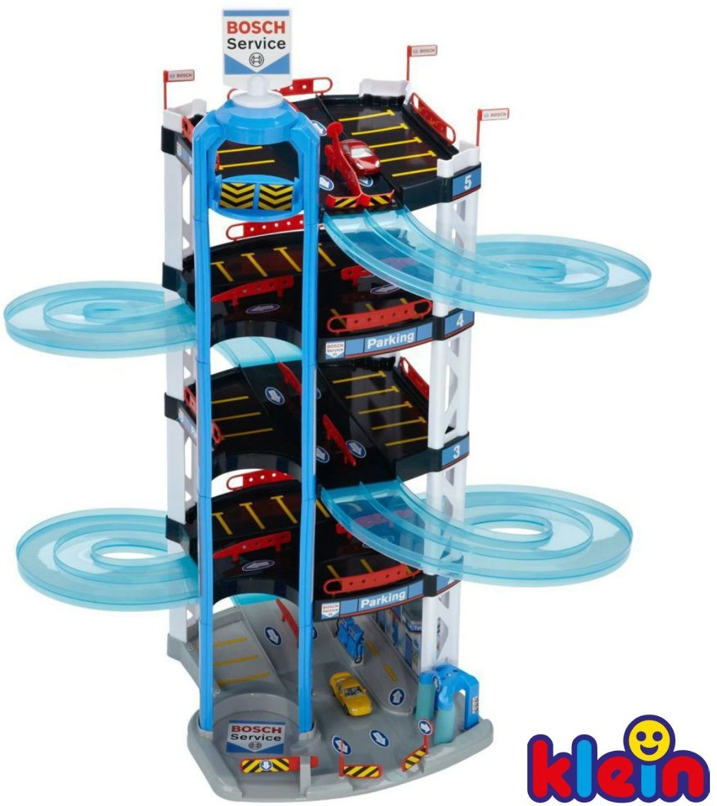 Šis tvirtas 5 aukštų BOSCH Service parkavimo garažo kompleksas iš Klein sukurtas mažiesiems lenktynininkams. Jis siūlo pusiau permatomas dvigubas spiralines rampas nuo viršutinio aukšto iki apačios, rankiniu būdu valdomą keltuvą mašinėlių perkėlimui tarp aukštų ir lenktynių startą/finišą dviem mašinėlėms. Kiekviename lygyje rasite pakankamai parkavimo vietų, o pirmame aukšte papildomai yra aptarnavimo zona su „stotimi“ realistiškam žaidimui.