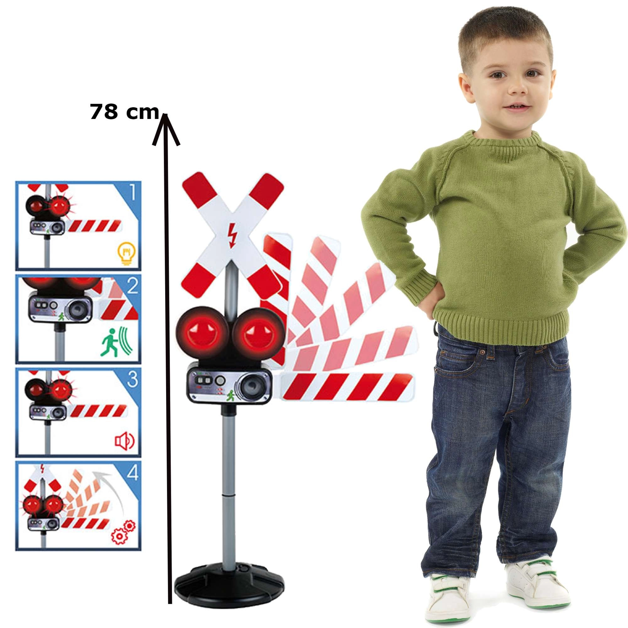 Signalizaciją galima aktyvuoti rankiniu būdu arba judesio jutikliu. Stabili bazė ir kokybiška konstrukcija užtikrina ilgaamžiškumą net kasdien žaidžiant. 78 cm aukštis sustiprina realistišką įspūdį ir puikiai tinka geležinkelio trasoms bei eismo rinkiniams.