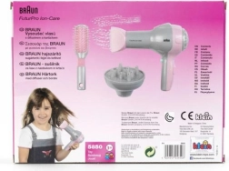 Vaikiškas Braun plaukų džiovintuvas su difuzoriumi ir šepetiu leidžia mažosioms kirpėjoms modeliuoti šukuosenas kaip profesionalėms. Jis neskleidžia šilumos, todėl yra saugus vaikams.