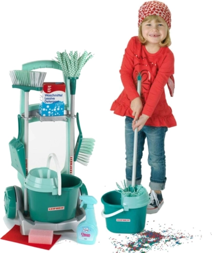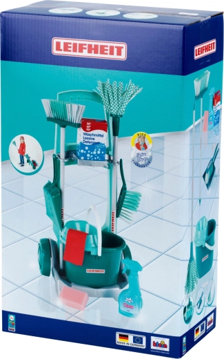 Vaikiškas valymo rinkinys su oficialia LEIFHEIT licencija atrodo kaip tikri įrankiai, bet yra saugiai pritaikytas mažiesiems pagalbininkams. Patvarus vežimėlis su ratukais turi įrankių laikiklius, lentynėlę kibirui ir vietą dėžutei su „detergentu“, todėl vaikai gali jaustis lyg tikrai tvarkytųsi.