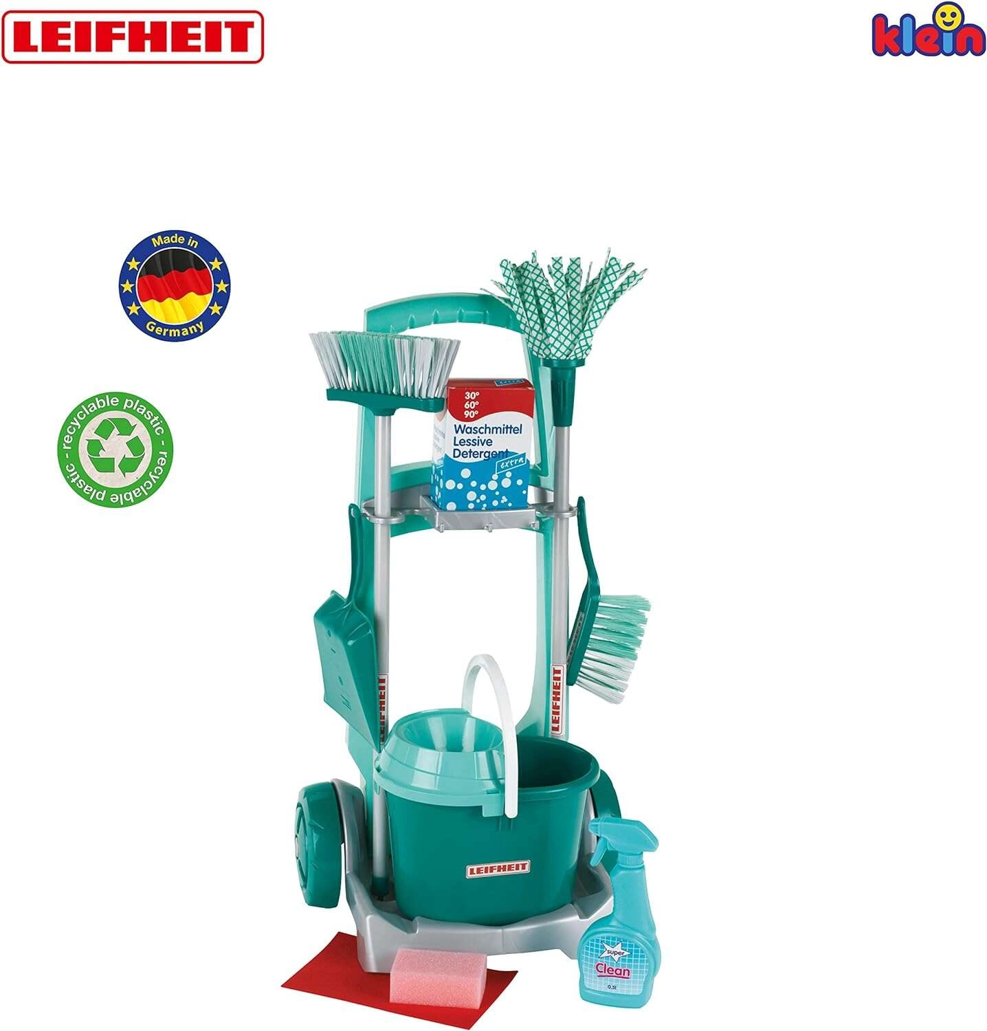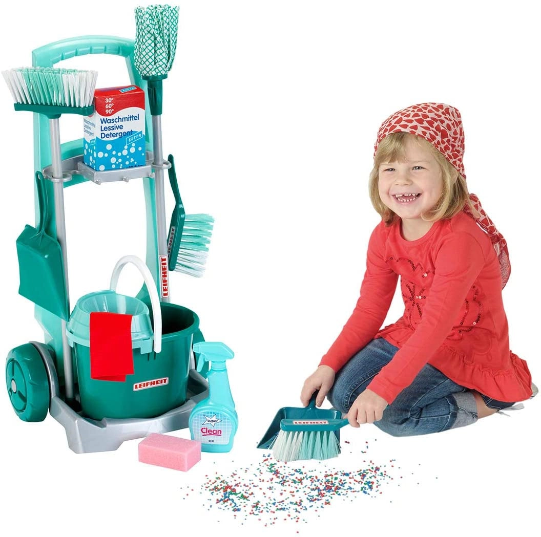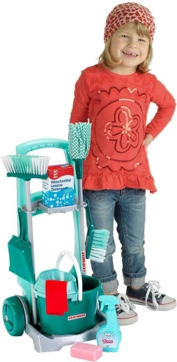 Stilingas vaikiškas valymo vežimėlis su LEIFHEIT licencija iš KLEIN suteikia realistišką namų ruošos žaidimą. Rinkinyje yra vežimėlis su ratukais, kibiras su gręžtuvu, šluostė (mopas), šluota, rankinė šepetėlė su semtuvėliu ir kiti priedai tikram valymo mėgdžiojimui. Dėl lengvų medžiagų ir apgalvotų laikiklių viską lengva valdyti ir iškart galima žaisti. Puikiai tinka motorikai lavinti, atsakomybei ugdyti ir kūrybiniam vaidmenų žaidimui nuo 3 metų.