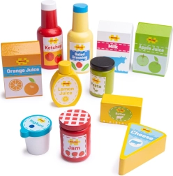 Šis kruopščiai sukurtas medinis rinkinys apima populiarius „ilgai negendančius“ produktus – pavyzdžiui, kečupą, padažą, pieną, obuolių, apelsinų ir citrinų sultis, uogienę, sviestą, pesto, sūrį ir jogurtą. Realistiškos formos ir spalvingos etiketės kviečia vaikus žaisti ir kartu nepastebimai moko atpažinti maisto produktus bei kalbėti apie sveiką mitybą.