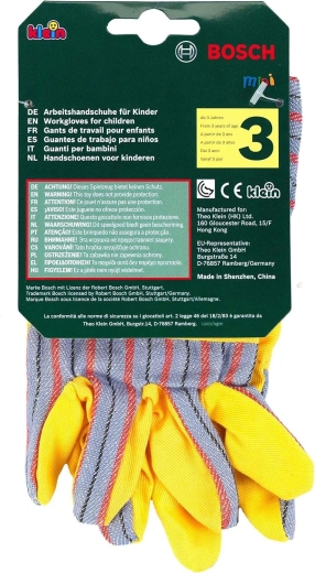 Vaikiškos darbo pirštinės BOSCH iš Klein prekės ženklo yra puikus priedas mažiesiems meistrams. Jos tikroviškai atkartoja tikras pirštines, turi geltonas delnų dalis su pilkais dryžuotais elementais, elastingas rankogales geresniam prigludimui ir puikiai tinka vaidybai – meistrams ir sodininkams.