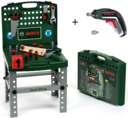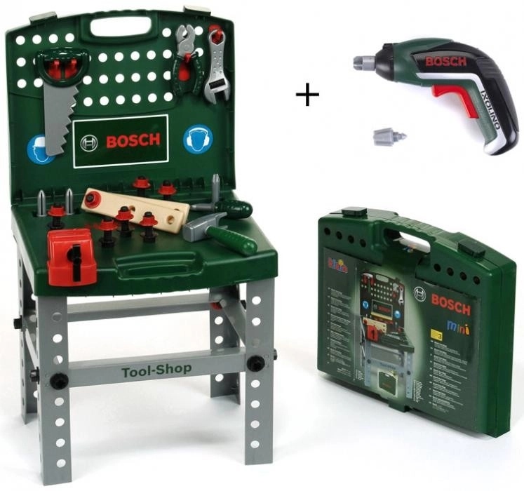 Nešiojama BOSCH dirbtuvė lagamine su akumuliatoriniu suktuvu Ixolino II. Siūlo platų priedų rinkinį, sulankstomą konstrukciją ir funkcijas: sukimas į dešinę/kairę, šviesa ir garsas su keičiamais antgaliais.