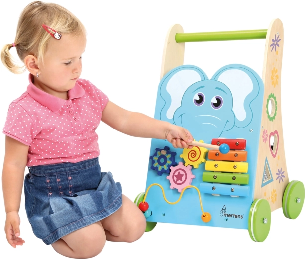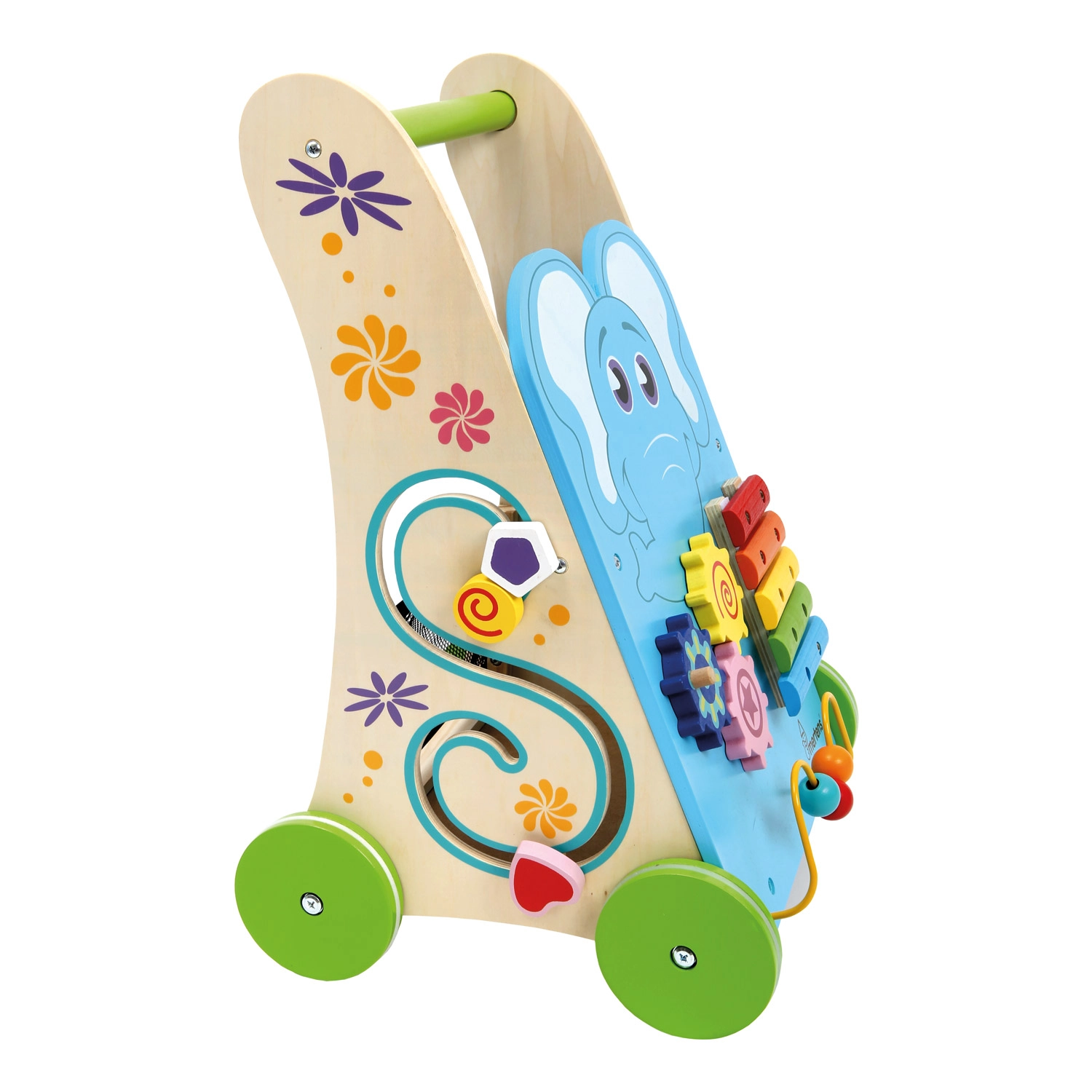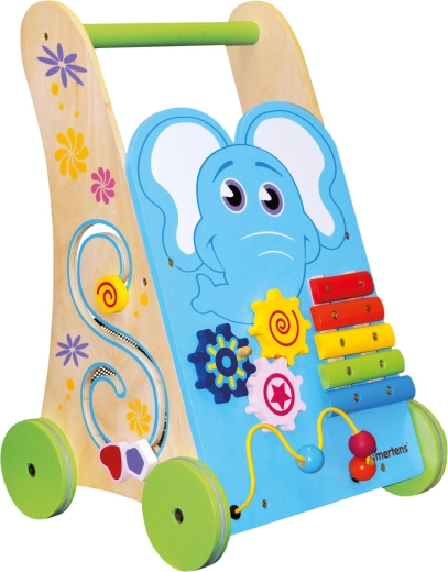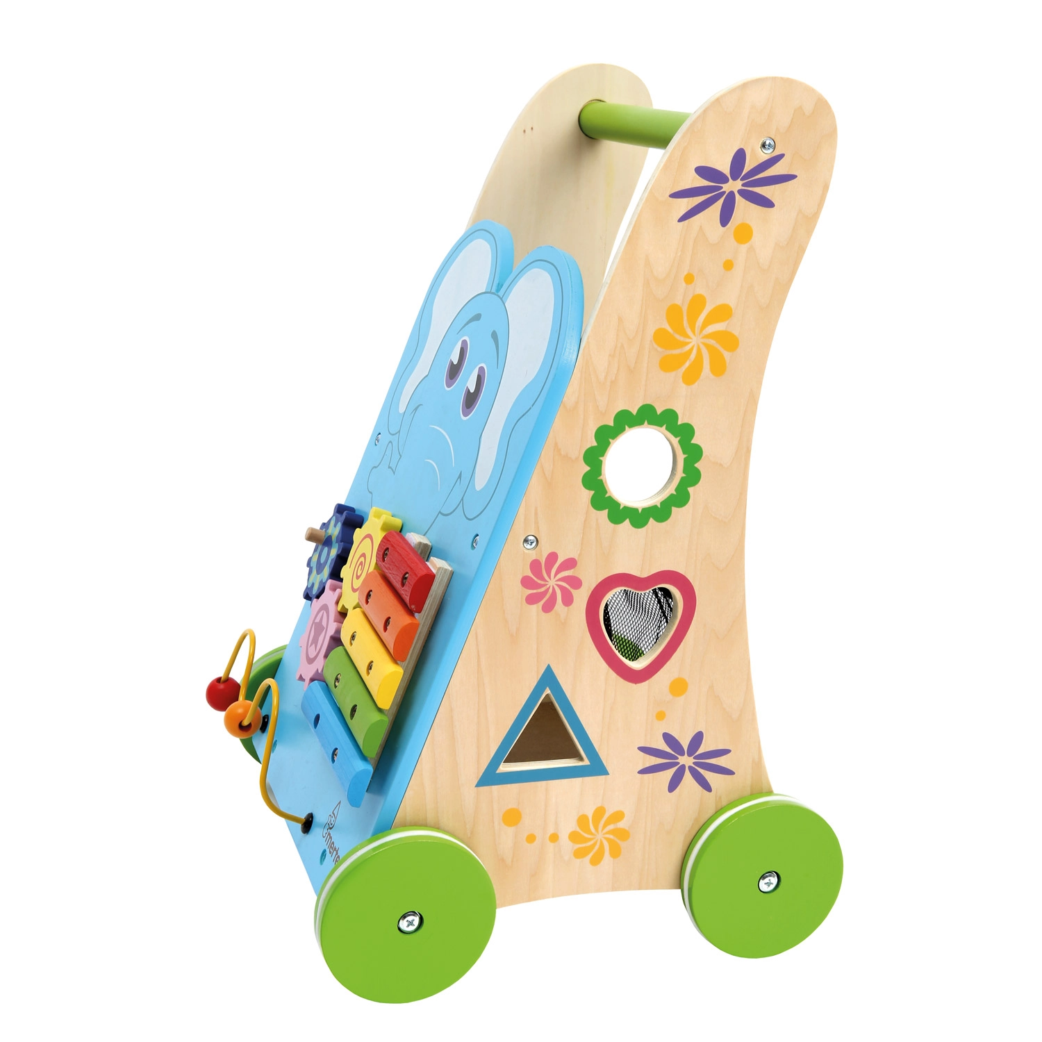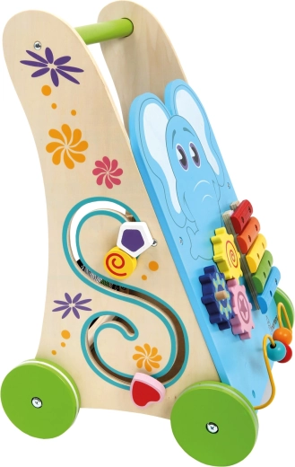 Ši daugiafunkcė medinė vaikštynė padeda vaikams treniruoti pusiausvyrą, koordinaciją ir smulkiąją motoriką. Priekinis skydelis pilnas veiklų: muzikinis ksilofonas su plaktuku, dantračių mechanizmai, karoliukų labirintas ir formelių rūšiuoklė, skatinantys susikaupimą ir loginį mąstymą.