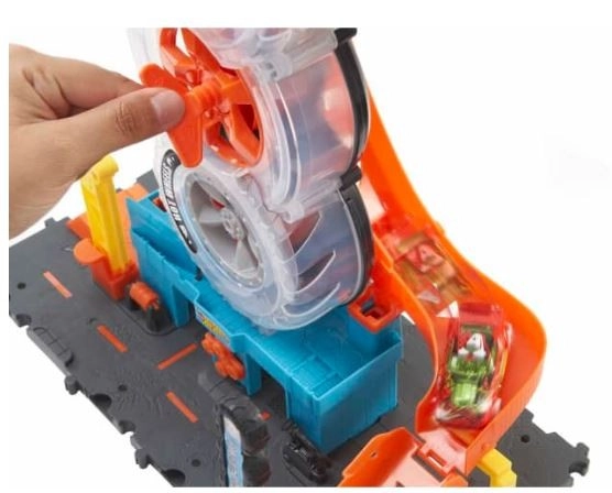 Šis žaidimų rinkinys visiškai suderinamas su kitais Hot Wheels rinkiniais, todėl vaikai gali susikurti savo lenktynių ir akrobatinių triukų pasaulį. Vienas automobilis yra komplekte, tačiau net keturi automobiliai gali vienu metu suktis padangų struktūroje, kas užtikrina begalę pramogų.