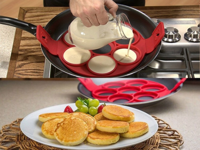 Ši daugiafunkcė forma iš maistinio silikono palengvina pusryčių ir greitų vakarienių ruošimą. Tiesiog padėkite ją ant keptuvės, pripildykite angas tešla ir, kai apkepa, naudodami šonines rankenėles apverskite – gausite tolygiai iškepusius ir tobulos formos blynelius be tešlos išsiliejimo.
