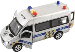 Tvirtas metalinis policijos automobiliukas su plastikiniais priedais pradžiugins visus mažus tvarkos sergėtojus. Jis siūlo šviesos ir garso efektus, atbulinės eigos įtempimą greitam startui, atidaromas dureles ir tiekiamas su baterijomis pakuotėje.
