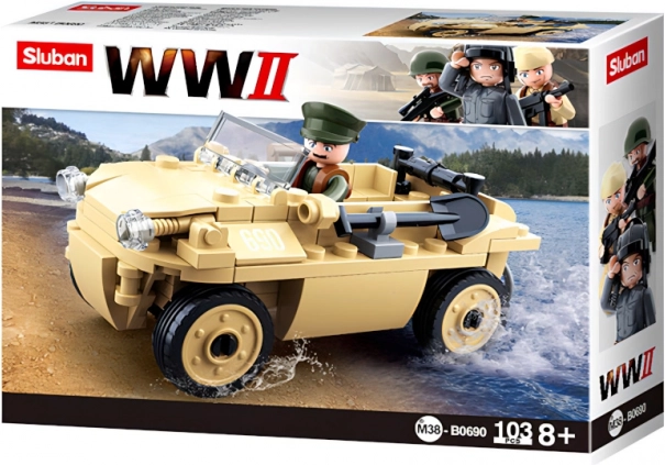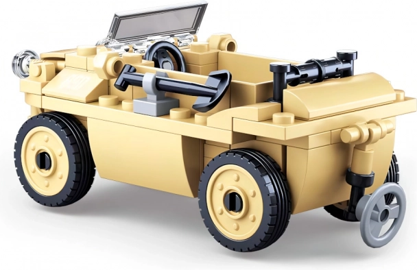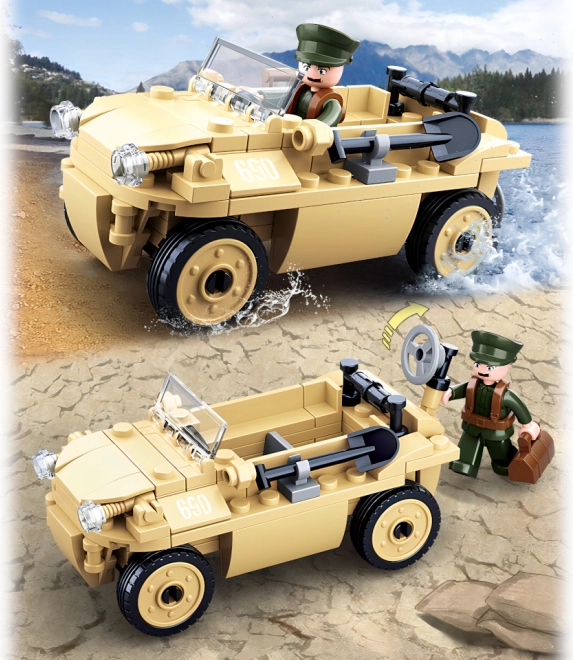 Konstruktorius siūlo detalią vokiško amfibinio automobilio repliką, praturtintą realistinėmis detalėmis, tokiomis kaip priekinis stiklas ir judantys ratai.