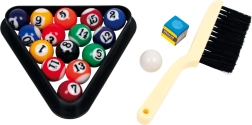 Rinkinyje yra viskas, ko reikia pradėti žaidimą: dvi lazdos, kamuoliukai, trikampis ir kreida. Šis mini stalas sukurtas taip, kad nedidelėje erdvėje suteiktų realistišką žaidimo patirtį.