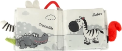 Su šia minkšta kontrastinių spalvų knygele jūsų mažylis leisis į gyvūnėlių pasaulio atradimus – nuo pelėdos iki beždžionėlės ir pandos, o taip pat meškėno, dramblio, krokodilo ar zebro. Juodai balti ir raudoni elementai skatina ankstyvąją vizualinę stimuliaciją, o įvairios tekstūros ir interaktyvūs elementai lavina smulkiąją motoriką ir akių–rankenų koordinaciją. Kiekviename puslapyje yra angliški gyvūnų pavadinimai, kas natūraliai prisideda prie pirmųjų žodyno žingsnių.