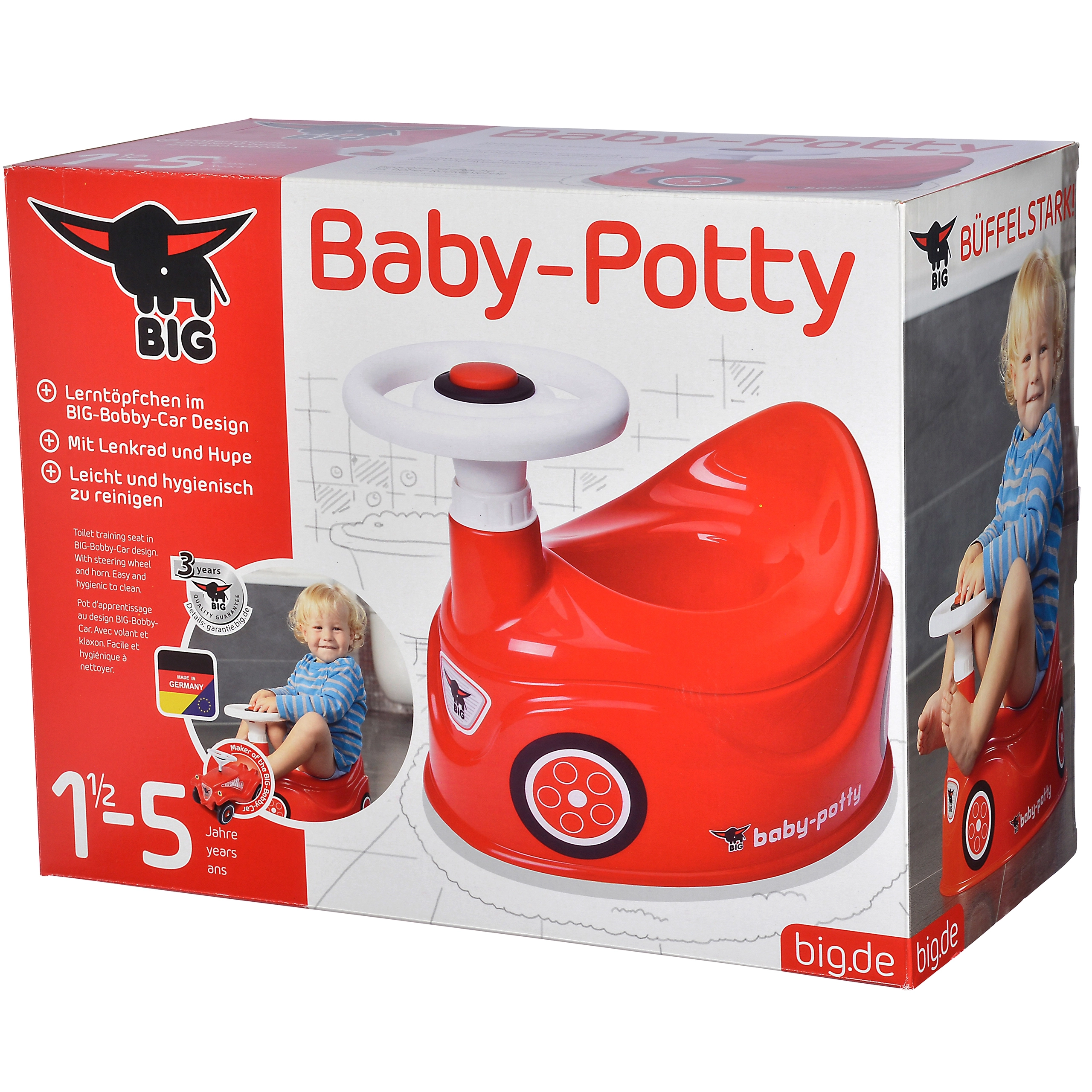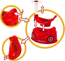 Paverskite pirmuosius ėjimus ant puoduko pramoga! Vaikiškas puodukas BIG New Bobby Car atrodo kaip tikras raudonas automobilis su vairu ir garsiniu signalu, turi aukštą atlošą, integruotą purslų apsaugą ir išimamą įdėklą lengvam valymui. Pagamintas iš kokybiškų, saugių medžiagų, kurias lengva prižiūrėti.