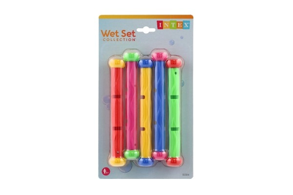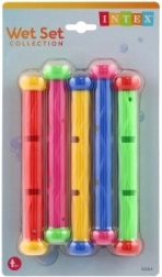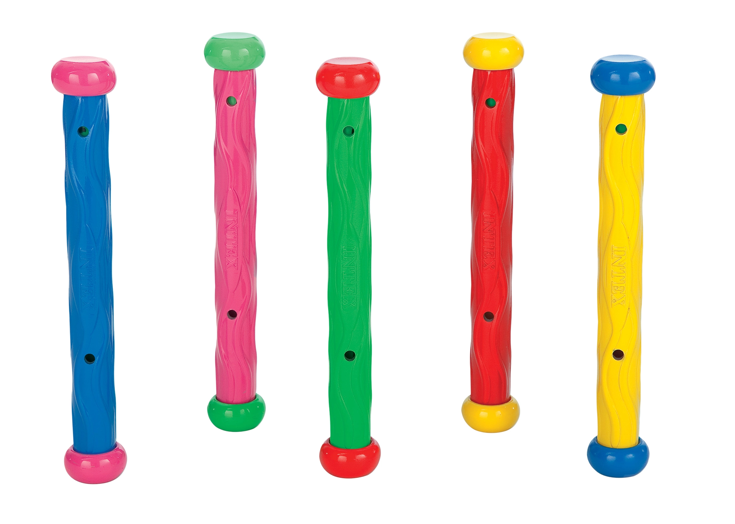 Smagus nardymo treniruočių rinkinys baseine: INTEX nardymo lazdelės pakuotėje po 5 vnt. dėl vidinio svarelio patikimai grimzta į dugną. Ryškios spalvos ir skaitmeninis taškų žymėjimas skatina vaikus varžytis, kiekvienos lazdelės ilgis 30 cm, padeda lavinti plaukimo įgūdžius.