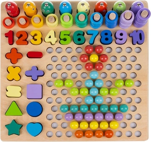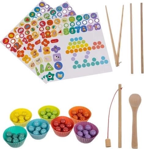 Šis išsamus medinis mokomasis rinkinys sujungia mozaiką su karoliukais, figūrų dėliojimą ir magnetinę žūklę. Vaikai žaismingai lavina skaičiavimą, spalvų rūšiavimą ir formų atpažinimą, kartu tobulina smulkiąją motoriką ir griebimą naudodami pincetą, lazdeles ir šaukštelį. Tinka savarankiškam žaidimui ir bendram mokymuisi su tėvais.