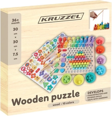 Linksma ir ugdomoji medinė mozaika su karoliukais, skaičiais ir figūromis lavina vaikų vaizduotę, loginį mąstymą ir smulkiąją motoriką. Dėl gausaus priedų rinkinio (pagalėliai, pincetas, šaukštelis, magnetinė meškerė, kortelės) siūlo ilgas kūrybiško žaidimo valandas, lavina skaičiavimą, spalvas ir formas bei skatina akių–rankų koordinaciją, kantrybę ir susikaupimą.