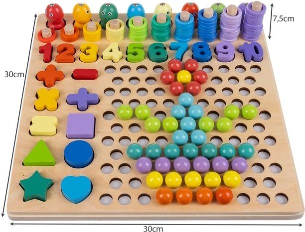 Medinė lenta su išpjovomis, skaitmenys, simboliai ir figūros moko vaikus pirmųjų skaičiavimo žingsnių ir logikos. Dėliojimas pagal pavyzdžius skatina koncentraciją ir padeda suprasti matematikos pagrindus.
