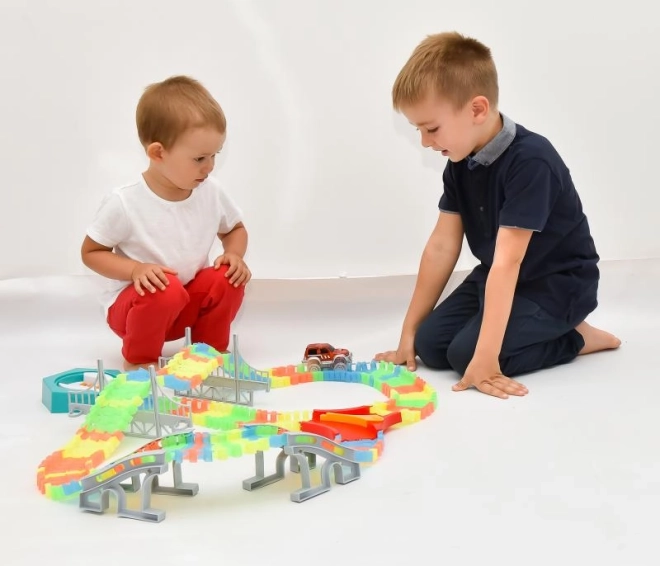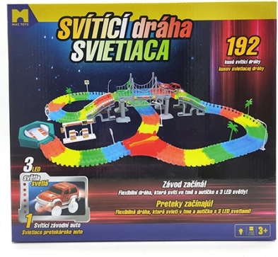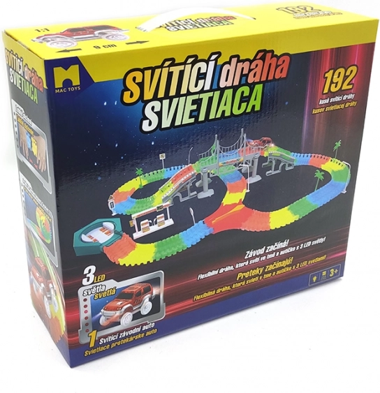 Susikurkite savo lenktynių ratą iš 192 spalvotų dalių ir mėgaukitės važiavimu su LED mašinėle, kuri apšvies kiekvieną posūkį. Dalys yra lanksčios ir lengvai susispaudžia, todėl vaikai gali greitai keisti trasos formą ir ilgį bei eksperimentuoti su tiltais, posūkiais ir nuolydžiais.