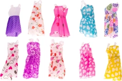 Rinkinyje yra suknelės įvairių spalvų ir raštų, įskaitant taškelius, širdeles ir gėles – idealiai tinka kūrybiškam lėlių rengimui.