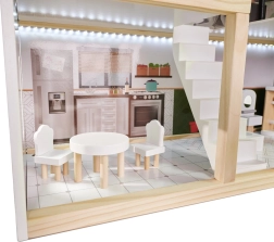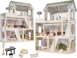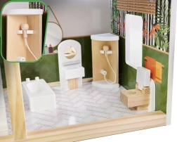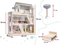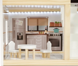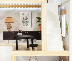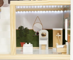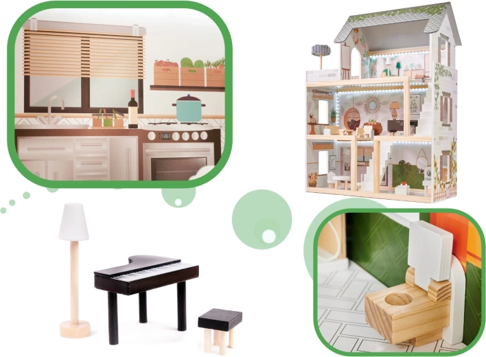 LULILO FLORO namelis švelnaus boho stiliaus derina natūralią išvaizdą, elegantiškas detales ir funkcinius sprendimus mažiesiems pasakotojams. Vaikai pamils keturis įrengtus kambarius – virtuvę, vonios kambarį, svetainę ir miegamąjį – bei erdvią terasą su gultu ir skėčiu nuo saulės. Integruotas LED apšvietimas pabrėžia žaidimo atmosferą dieną ir vakare.