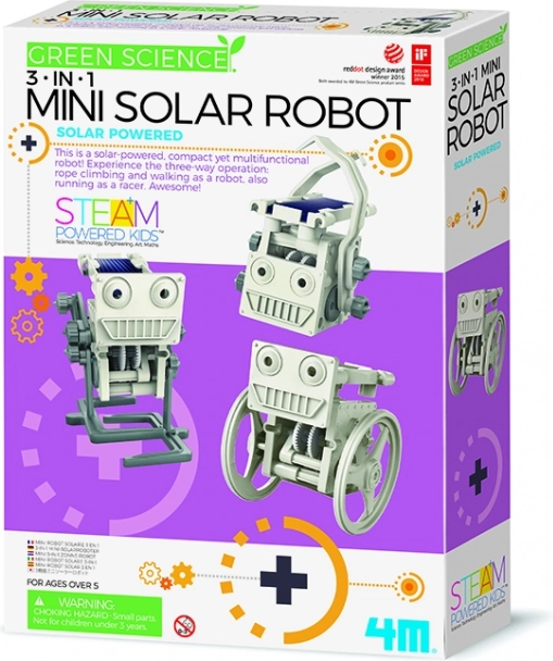 4M rinkinys Saulės robotai 3 viename puikiai tinka smalsiems tyrinėtojams nuo 8 metų. Vaikai praktiškai išbandys, kaip veikia saulės pavara, susipažins su mechanikos pagrindais, o konstruodami lavins kantrybę ir smulkiąją motoriką. Baigti modeliai juda tiesioginėje saulėje arba po stipriu šviesos šaltiniu.